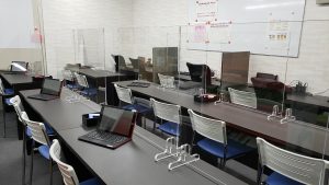 普段、生徒の皆さんが授業を行うAHBブースは、向かい合う席をゼロにして、一方向での座席配置を行い、2人席を一人で使用することによって、生徒同士の接触がなくなるような座席配置にしております。