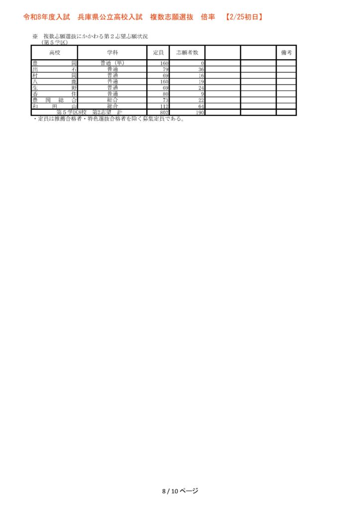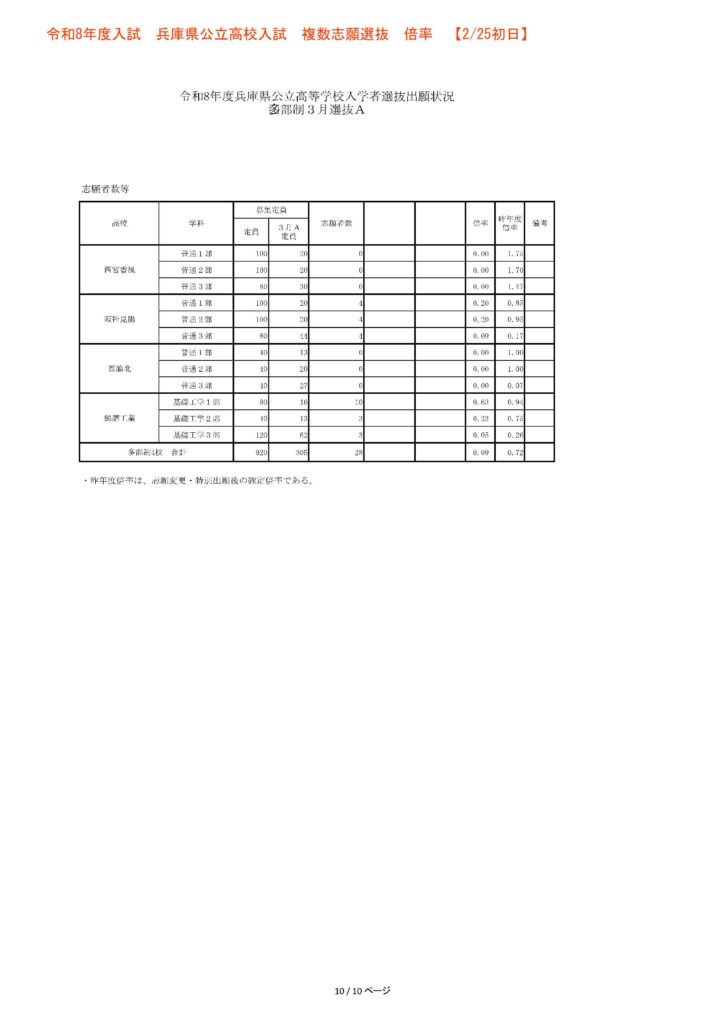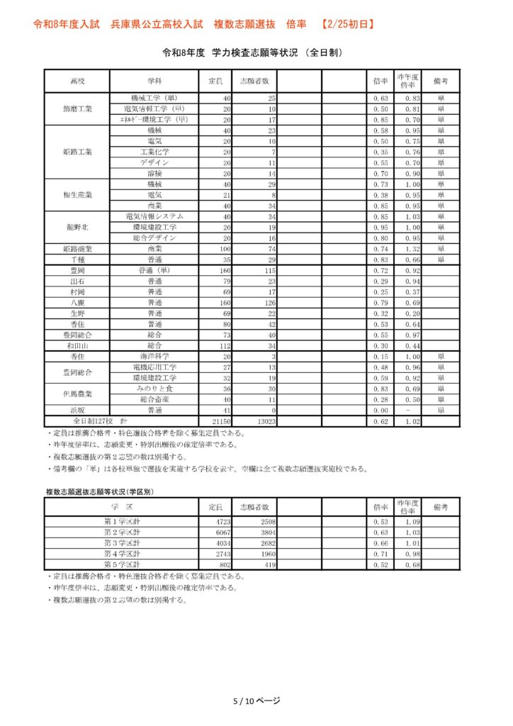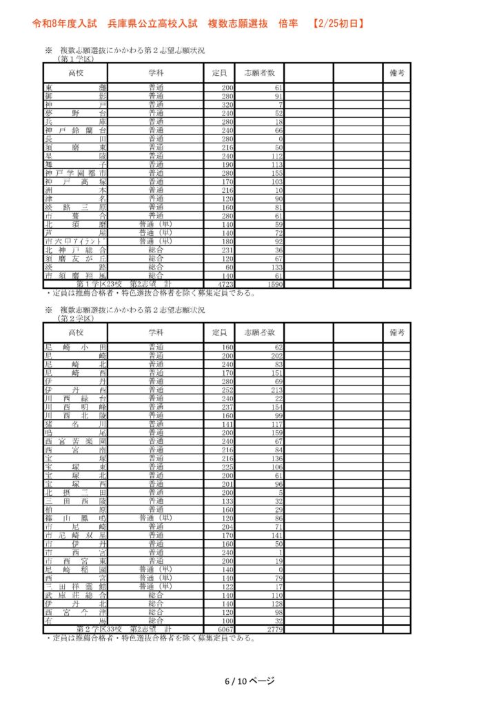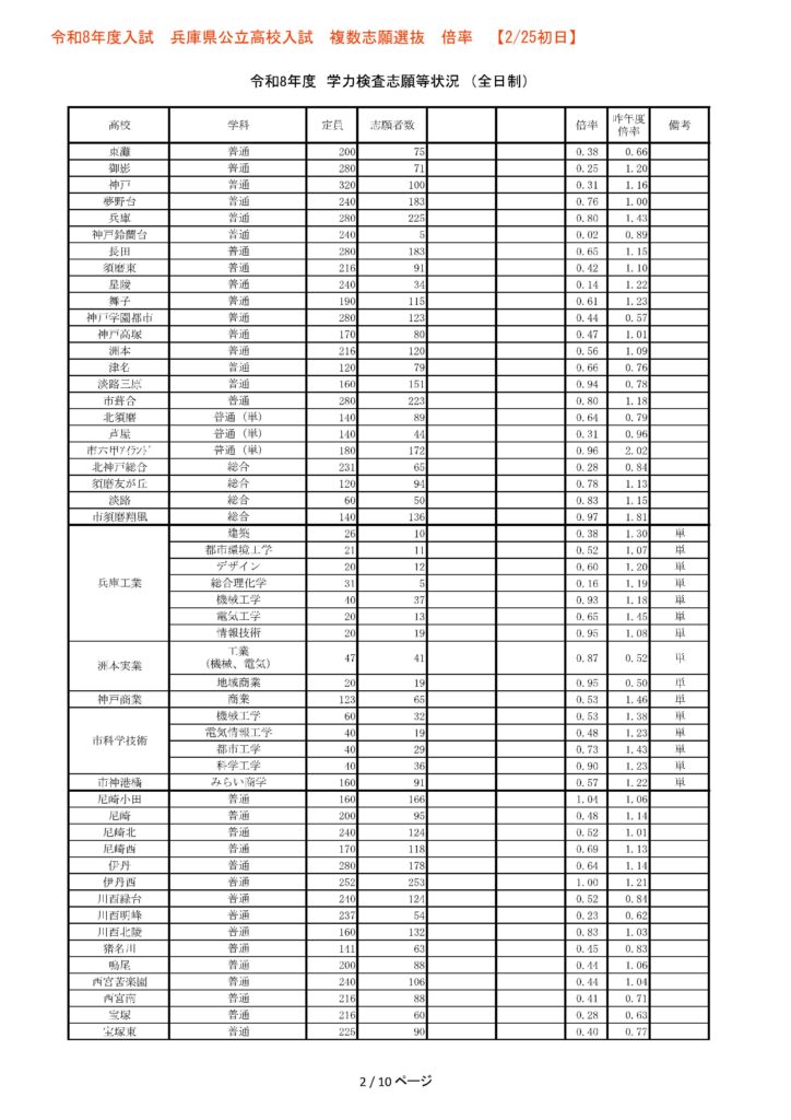 【2/25速報】兵庫県公立高校入試 複数志願選抜 倍率