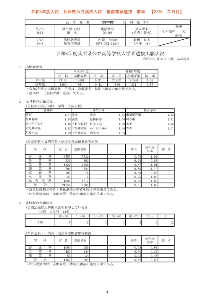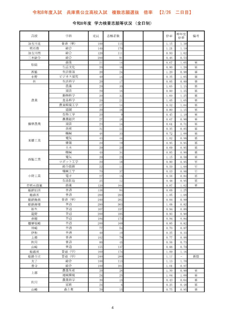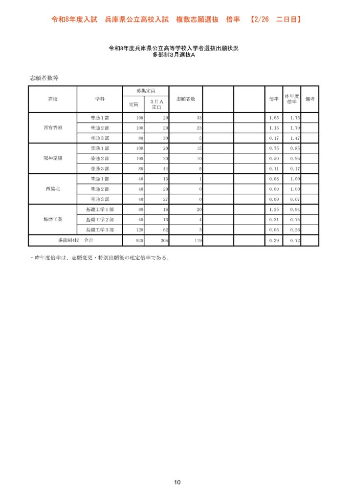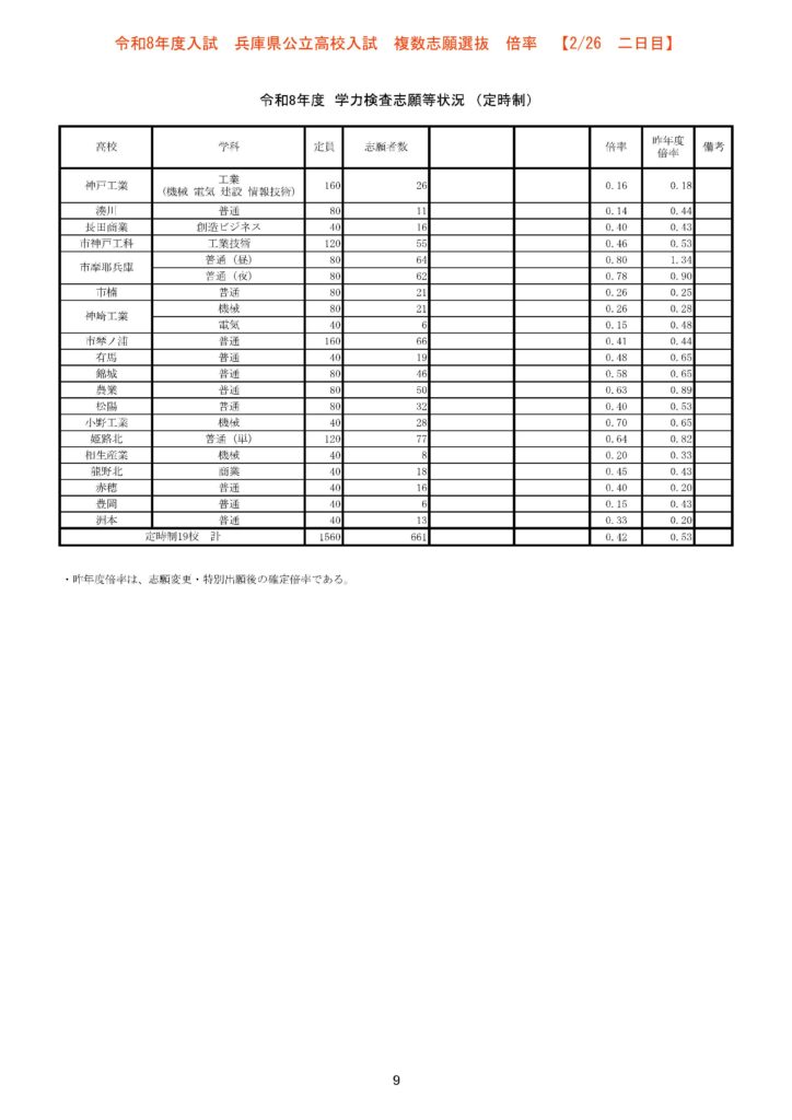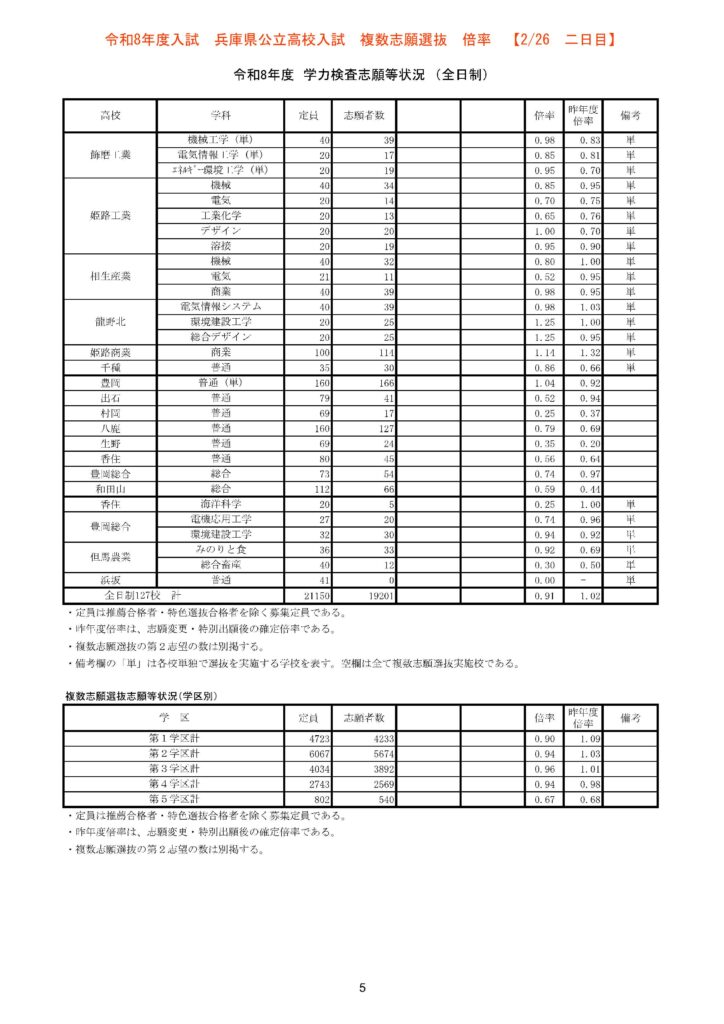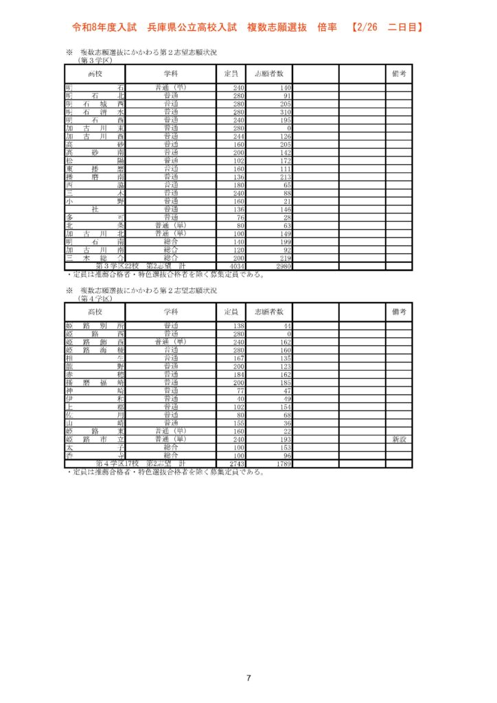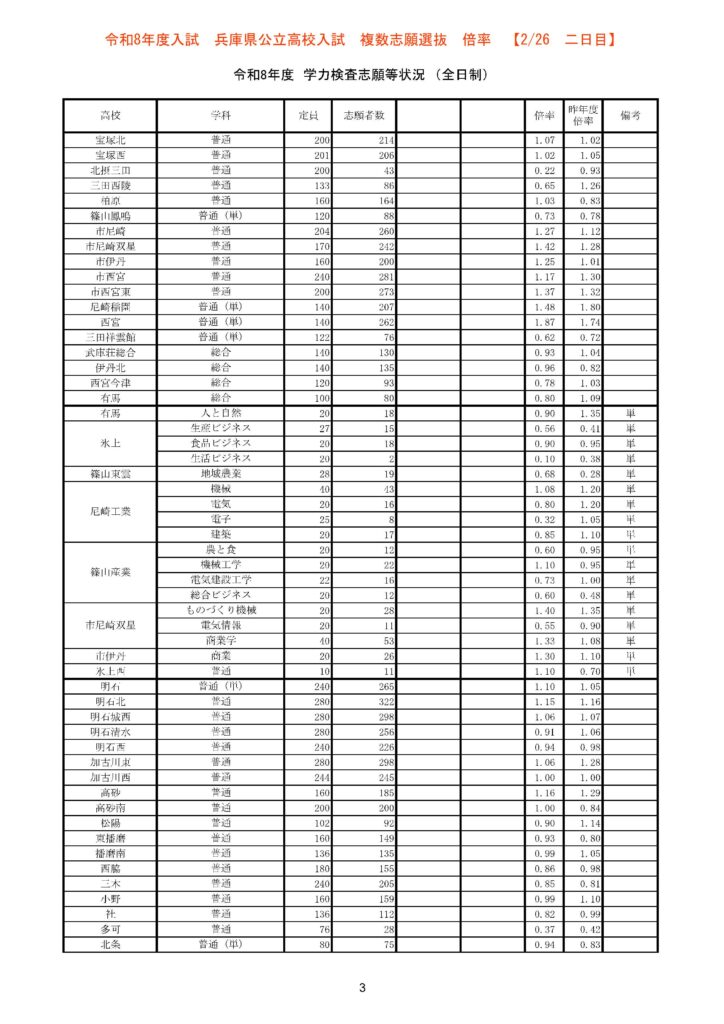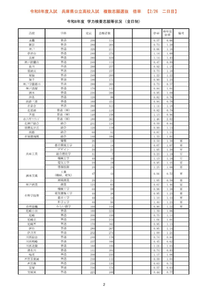 【2日目】2/26 2026年度兵庫県公立高校入試 複数志願選抜 倍率