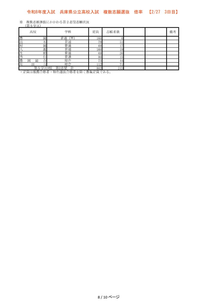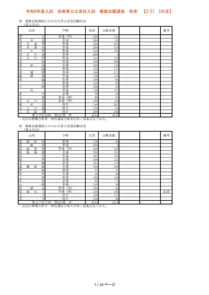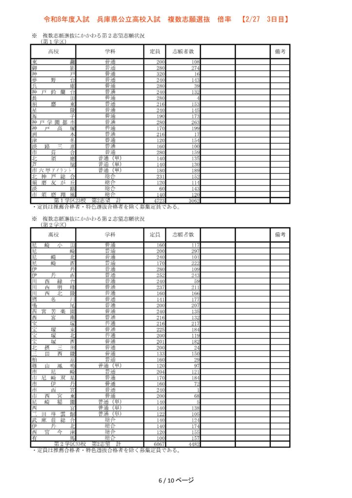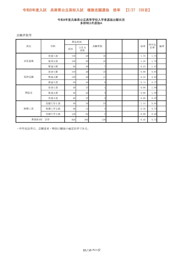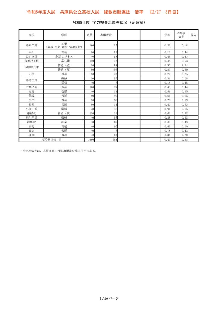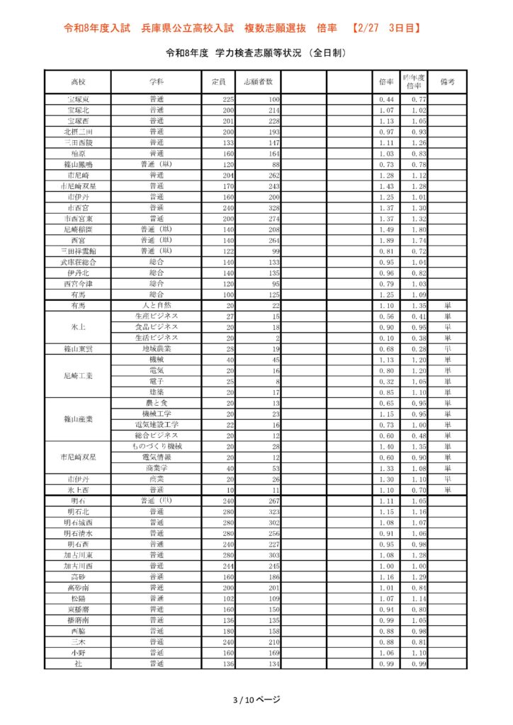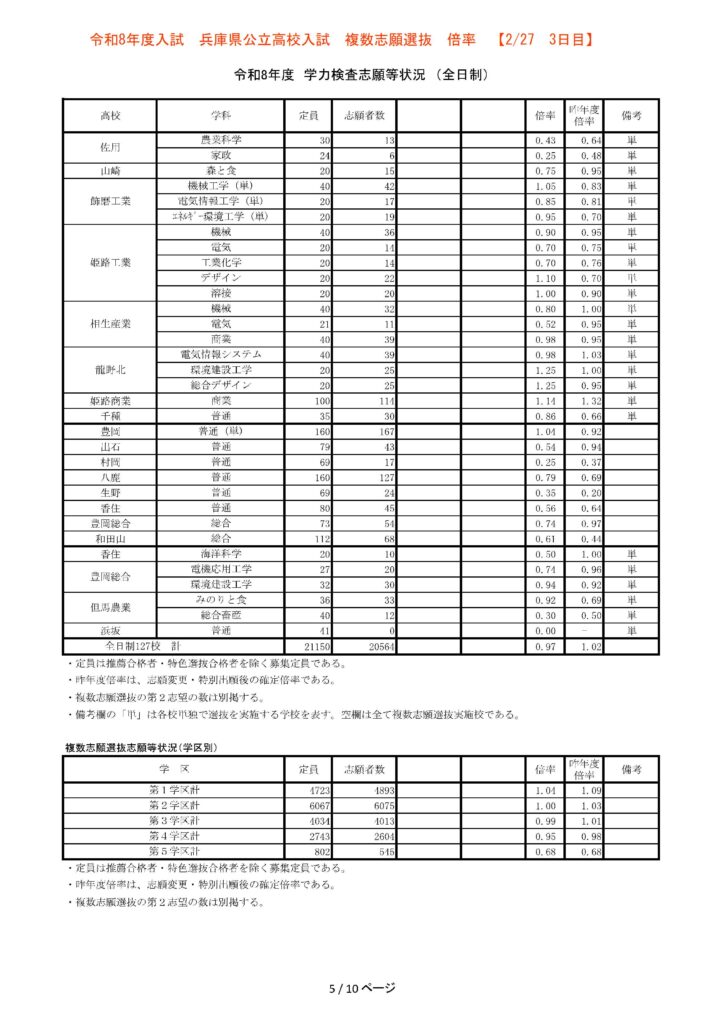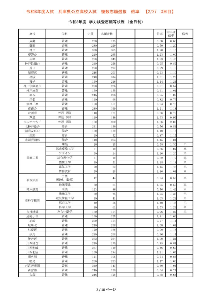 【3日目】2/27 2026年度兵庫県公立高校入試 複数志願選抜 倍率