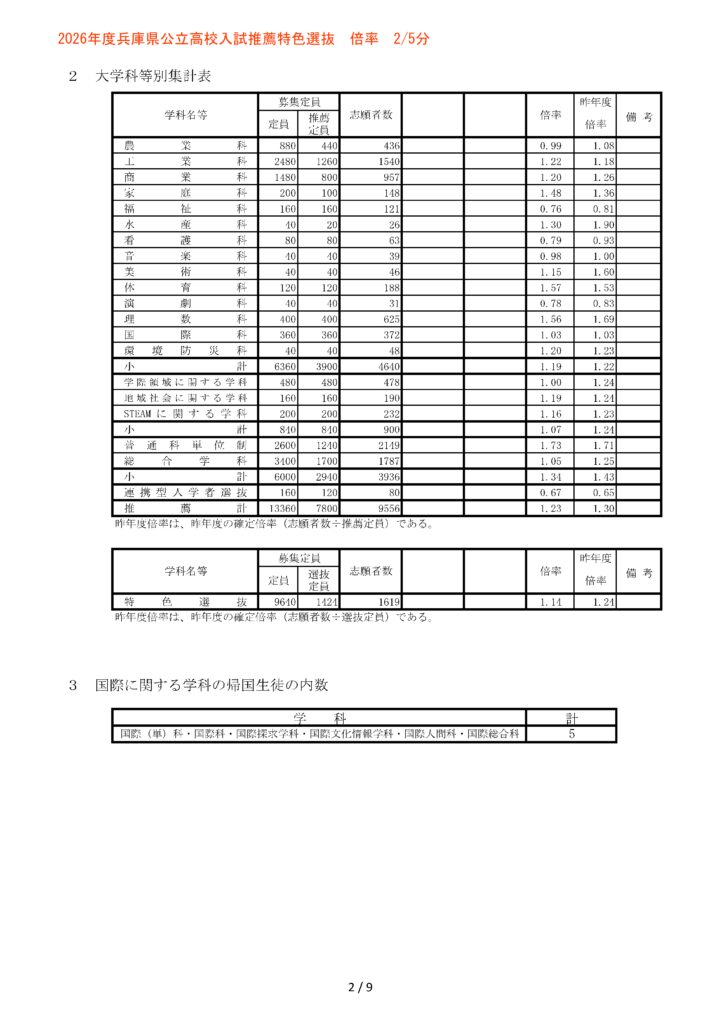2026年2月5日、兵庫県教育委員会より推薦・特色選抜の志願状況が発表されました。