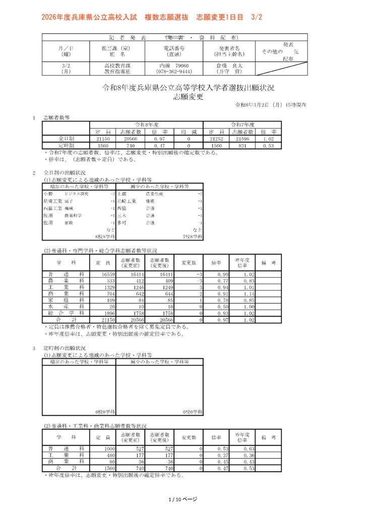 令和8年(2026年)3月2日、兵庫県教育委員会より「志願変更1日目(15時現在)」の出願状況が発表されました。受験生の皆さんが最後にどこで勝負を決めたのか、その動きを詳しく分析します。
