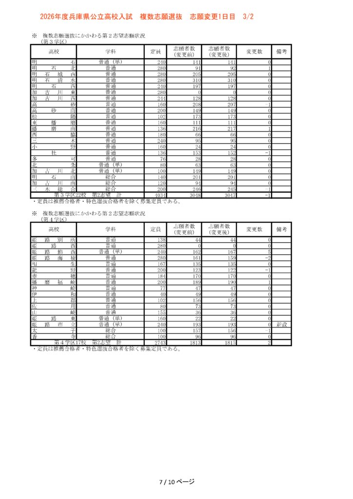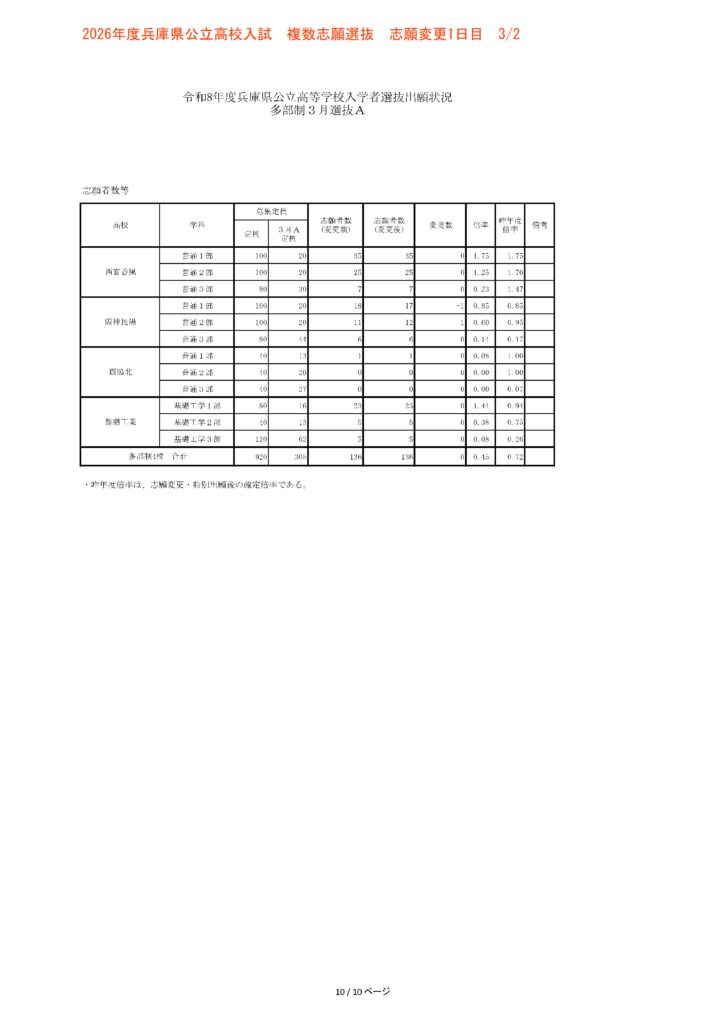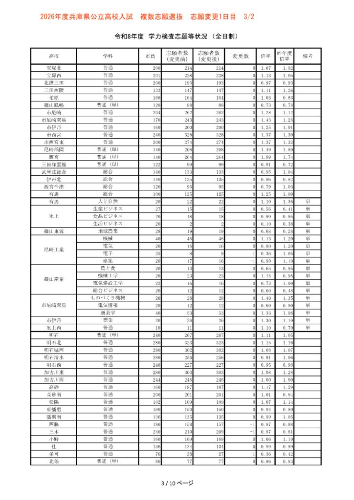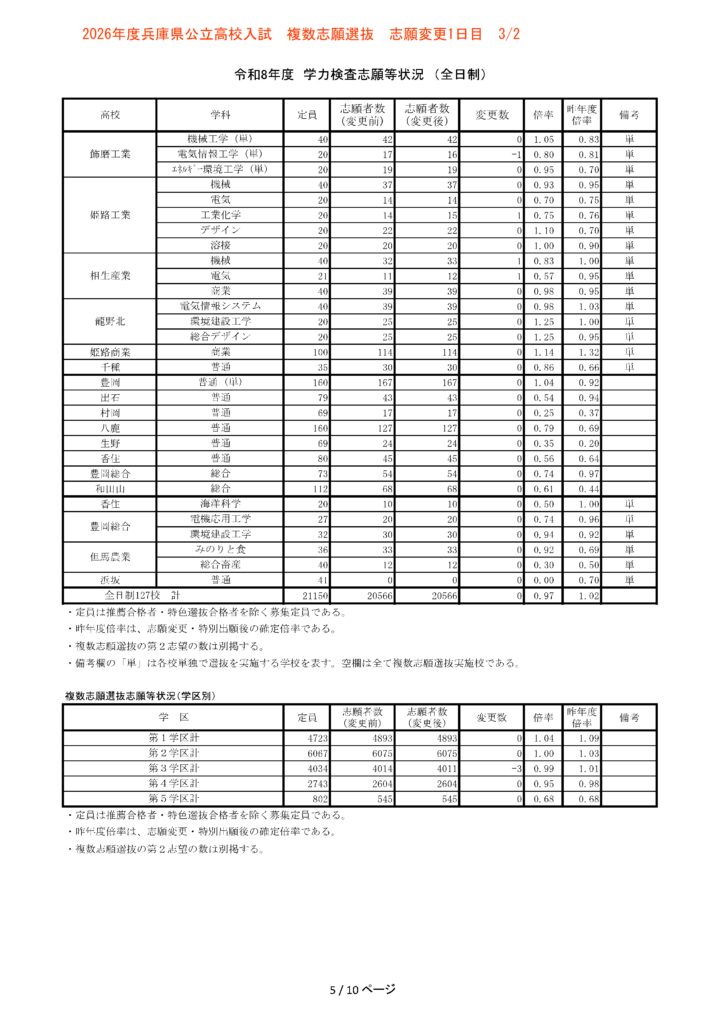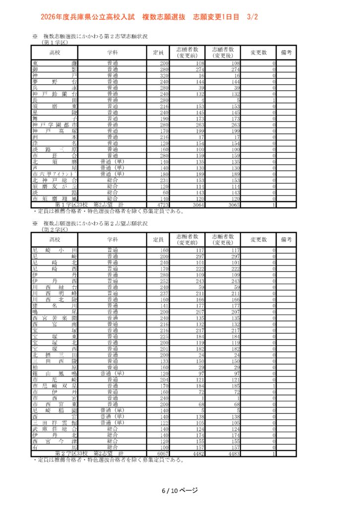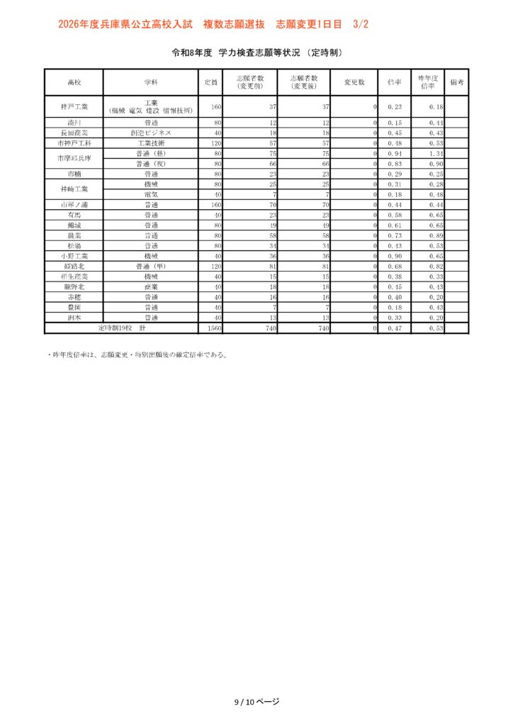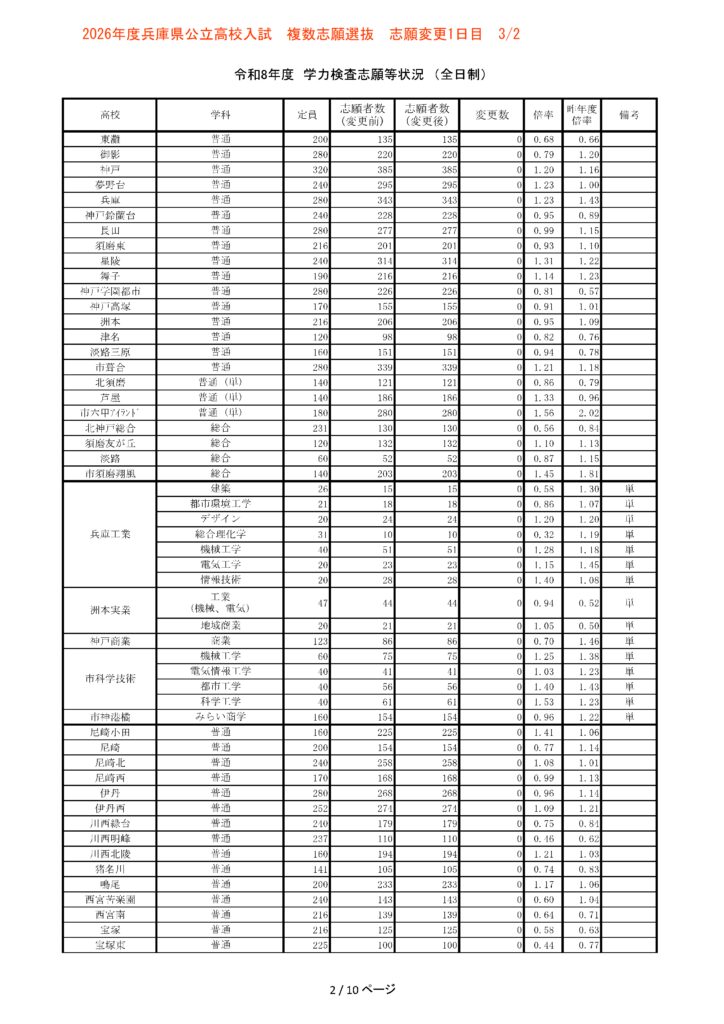 【3/2志願変更1日目】2026年度兵庫県公立高校入試 複数志願選抜 倍率