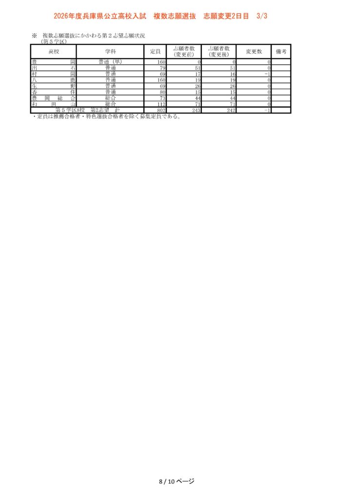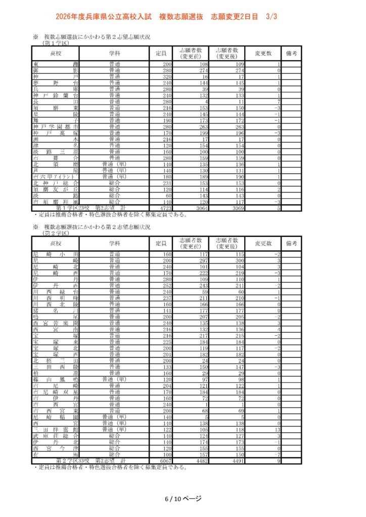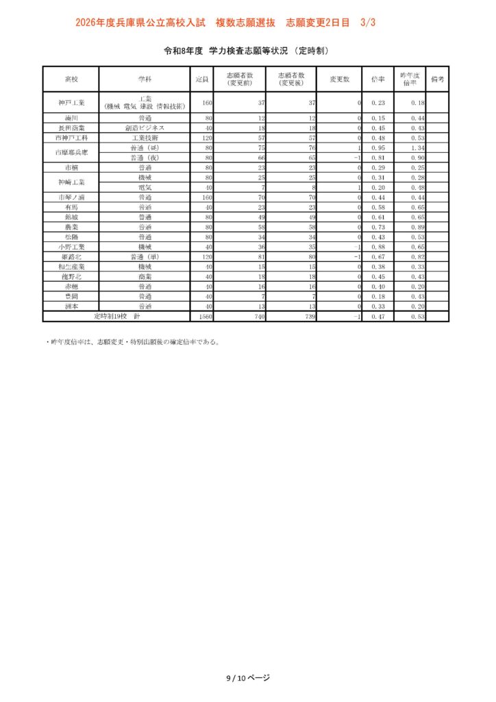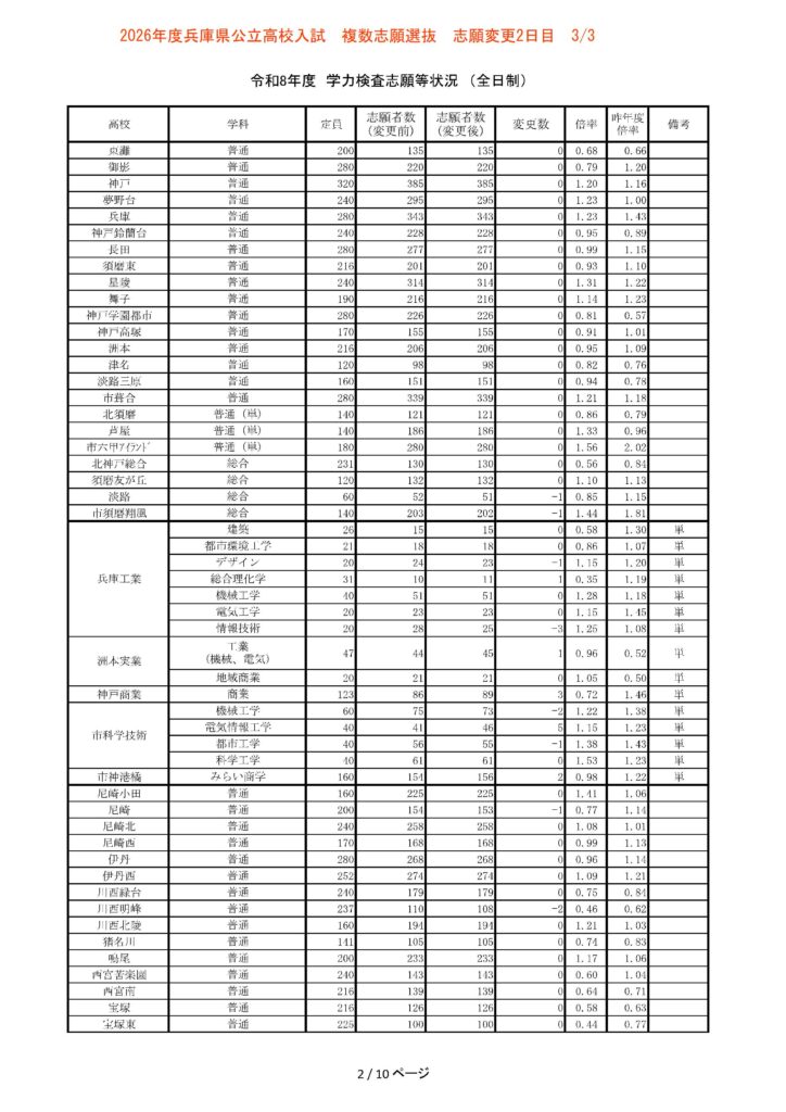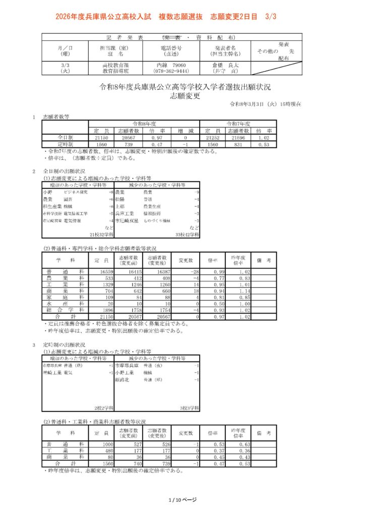 令和8年(2026年)3月3日15時現在、兵庫県公立高校入試の志願変更2日目の中間報告が発表されました。志願変更の締め切りは明日・3月4日(水)となっており、本日の数値は最終確定前、最後の中間集計となります。