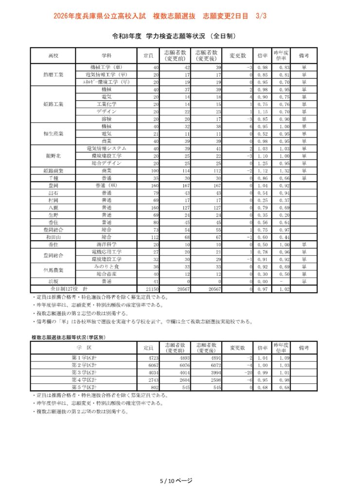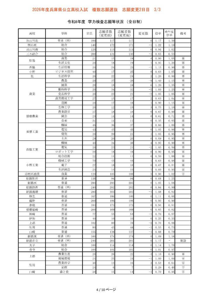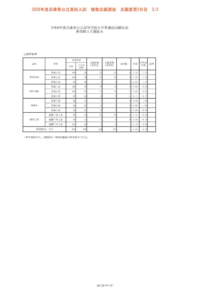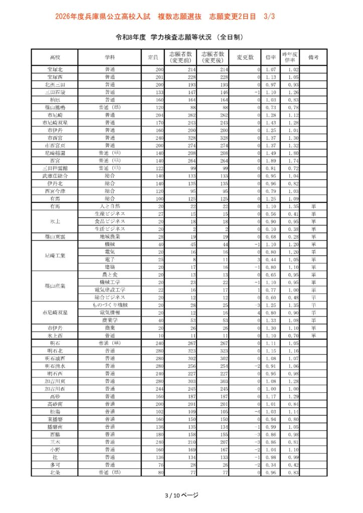 【3/3志願変更2日目】2026年度兵庫県公立高校入試 複数志願選抜 倍率