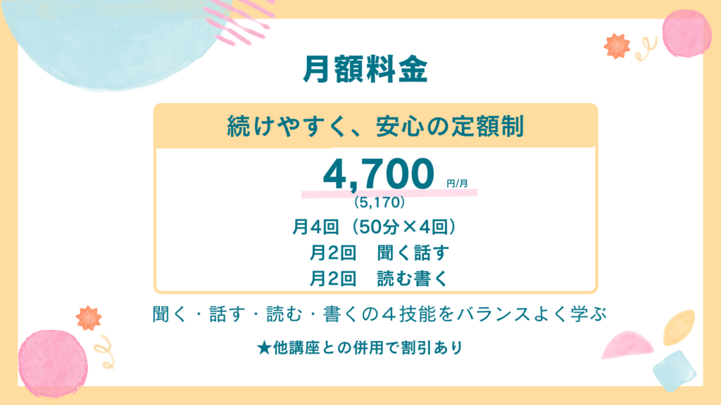 月会費のセット割引 2講座受講で1,000円(税込1,100円)割引、3講座受講で2,000円(税込2,200円)割引