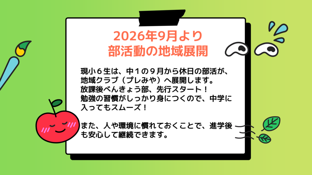 来年(中学1年の9月)からは、部活動が「地域クラブ(プレみや)」へ展開します。