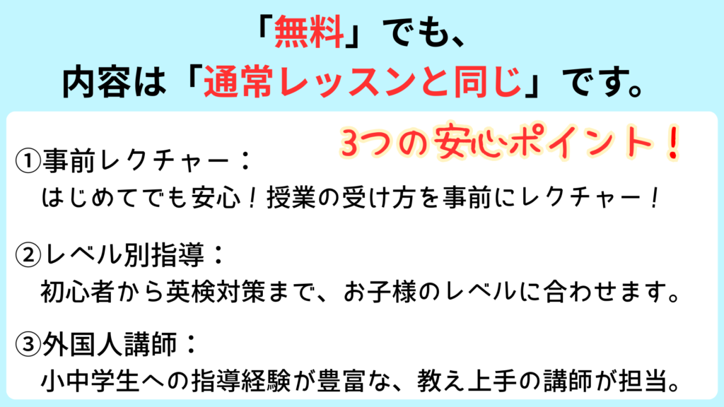 ただの「お試し」ではありません。お子様が「英語って楽しい!」「これなら続けられる!」と自信を持つための、成功体験をお届けする特別な時間です。