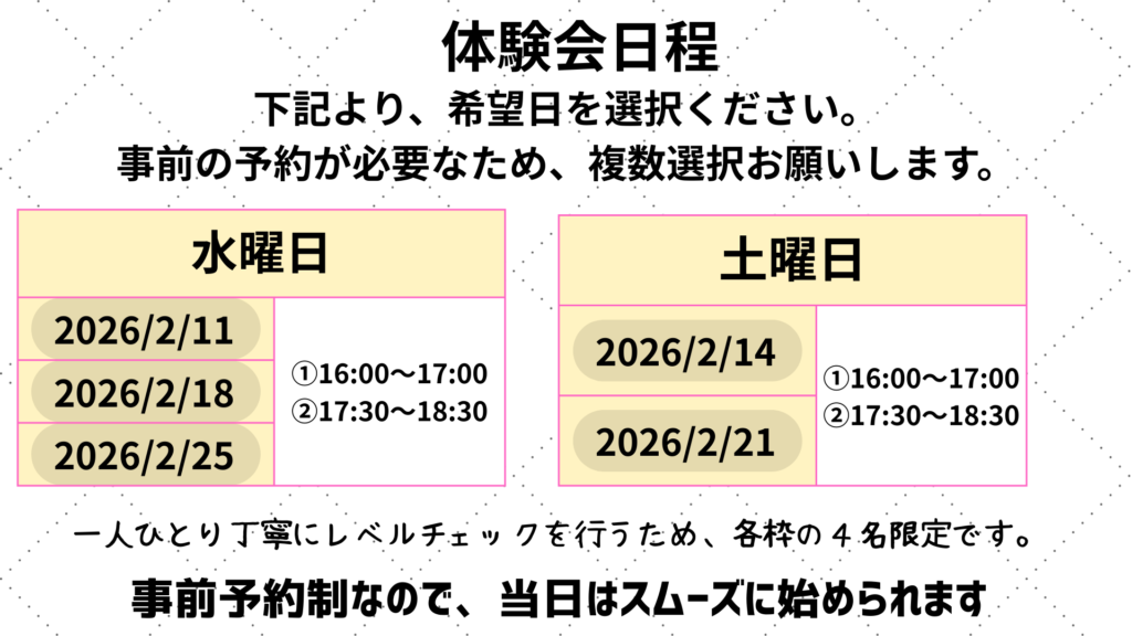 体験会は、通いやすい「水曜日」と「土曜日」に開催いたします。