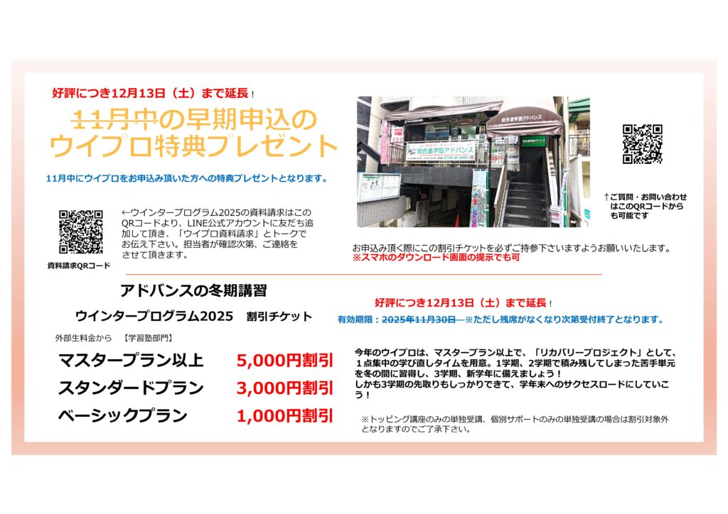 そんな“やりたい勉強”ができるアドバンスの冬期講習 ウインタープログラム2025の解説動画はこちら。