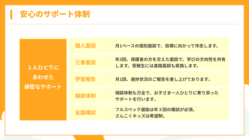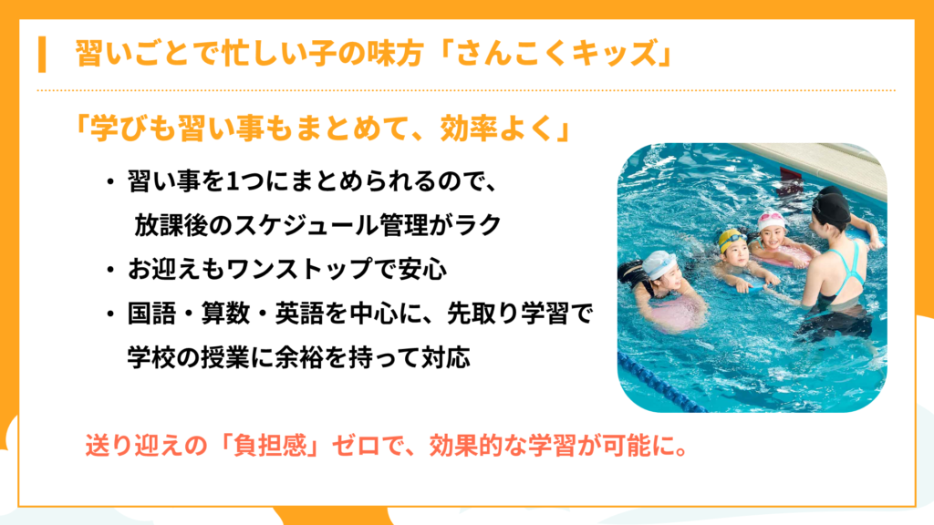 「習い事と勉強の両立が大変」という声に応えて生まれたのが「さんこくキッズ」。国語・算数・英語の基礎を中心に、先取り型で学習を進めます。送迎や習い事もまとめて対応できるので、保護者の負担も軽減されます。