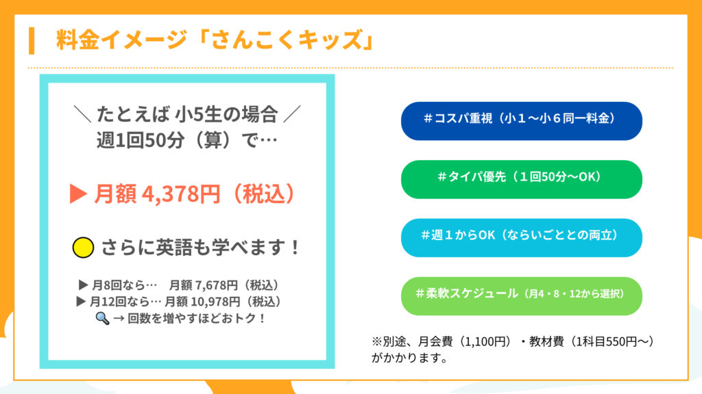 | さんこくキッズ料金表 | 教科 | 小1~小6料金 |