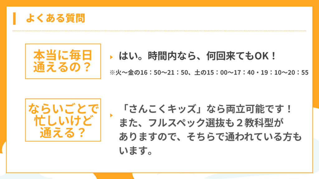 A. さんこくキッズコースなら習い事との両立を前提に設計されています。トッピング講座受講で習い事をワンストップできるので、時間の負担を軽減できます。
