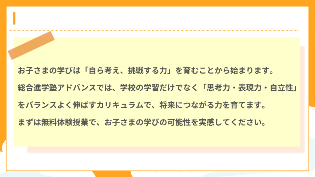 子どもたちが社会に出るとき、必要とされる力は「知識」だけではありません。自分で考え、調べ、行動できる力が将来を切り拓く鍵となります。アドバンスは、成績を上げること以上に、子どもたちが自分で学ぶ習慣と姿勢を育むことを重視しています。