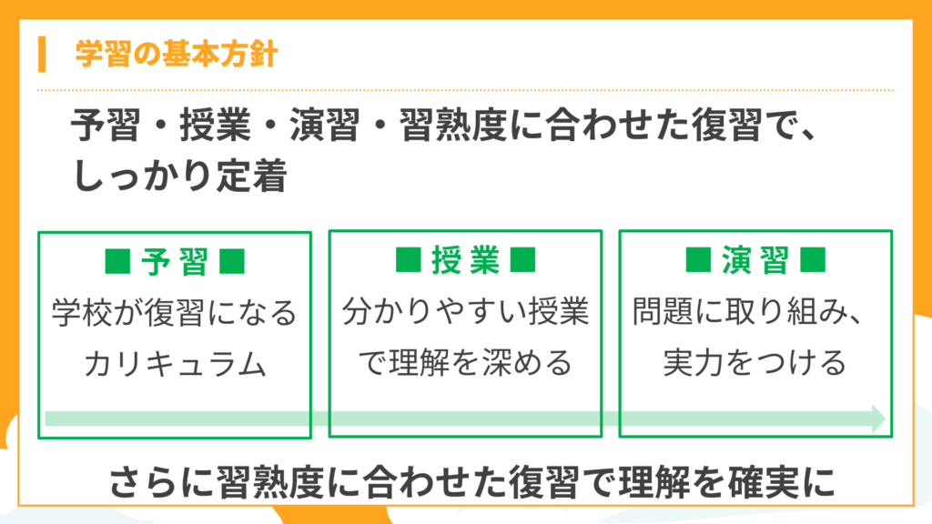 A. 予習・演習・復習のサイクルで進めるため、学力に応じて無理なく取り組めます。必要に応じて講師がサポートするので安心です。