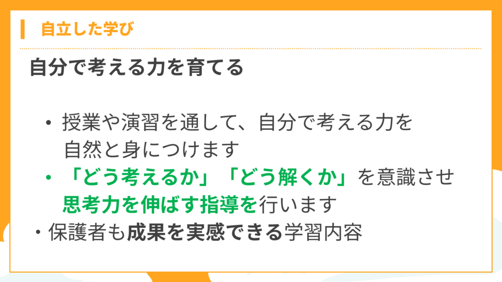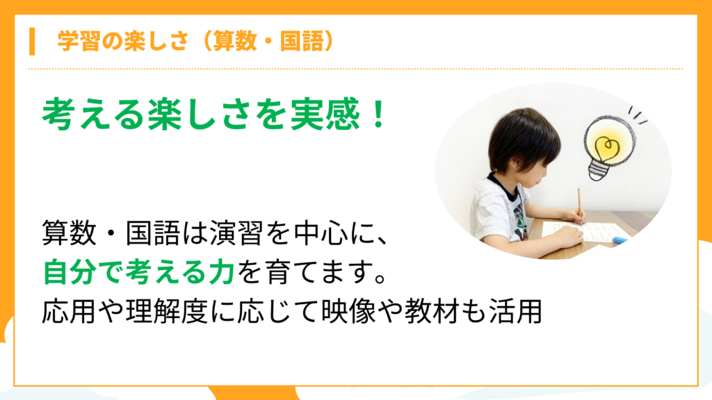 どちらも「自ら学ぶ力を育てる」という軸は共通。ご家庭やお子さまに合わせて、最適なスタイルをお選びいただけます。