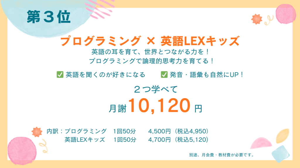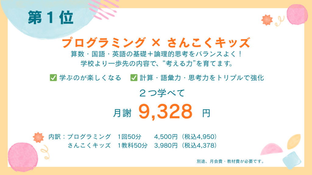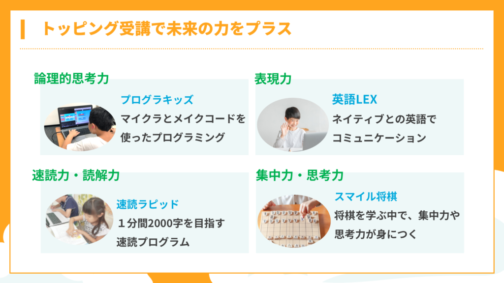 国語・算数の基礎に加え、英語やプログラミングといった「未来に役立つ学び」をトッピングとして追加できます。子どもの興味や成長に合わせて選択できるため、無理なく幅広い力を育てられます。