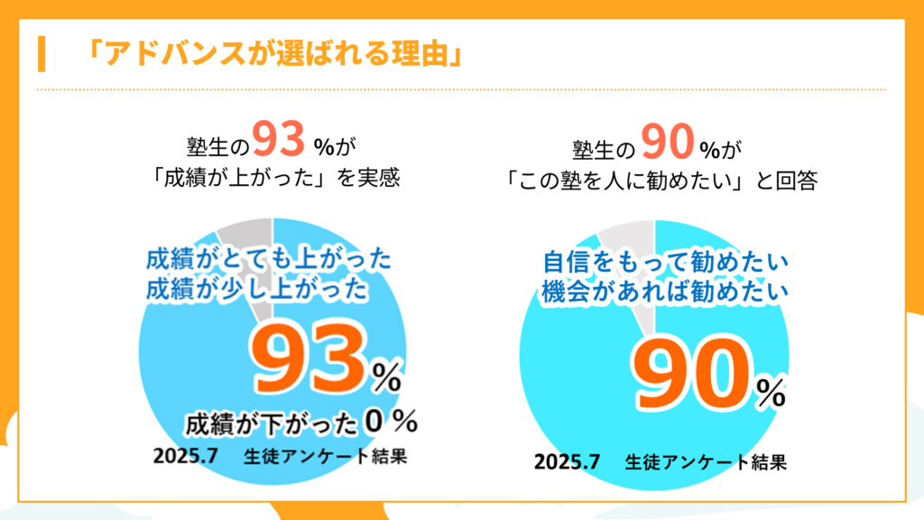 アドバンスは特別な子どもだけの場所ではありません。むしろ、勉強に少し不安がある子、部活や習い事と両立したい子、マイペースで学びたい子にこそ向いています。子どもが安心して学べる環境を整え、着実に力を伸ばせる仕組みがあるからです。