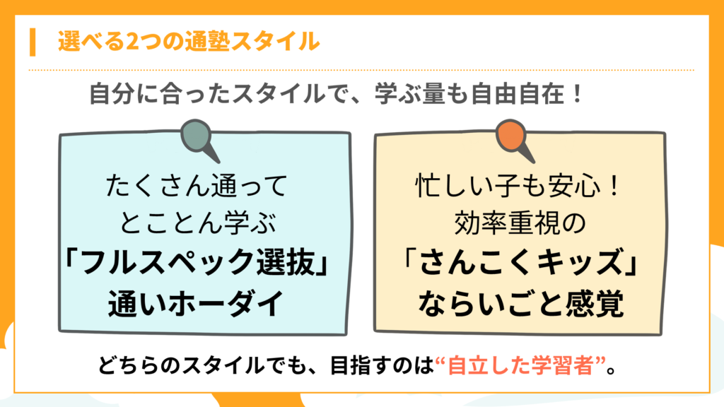 小学生の学び方は、一人ひとりの生活リズムや目的によって大きく異なります。アドバンスでは、その違いに応えるために「フルスペック選抜」と「さんこくキッズ」の2つのスタイルを用意しました。