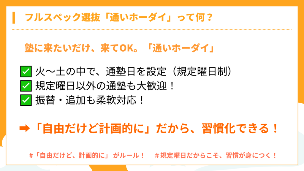 フルスペック選抜:通いホーダイ、演習中心+映像、予習・復習まで充実