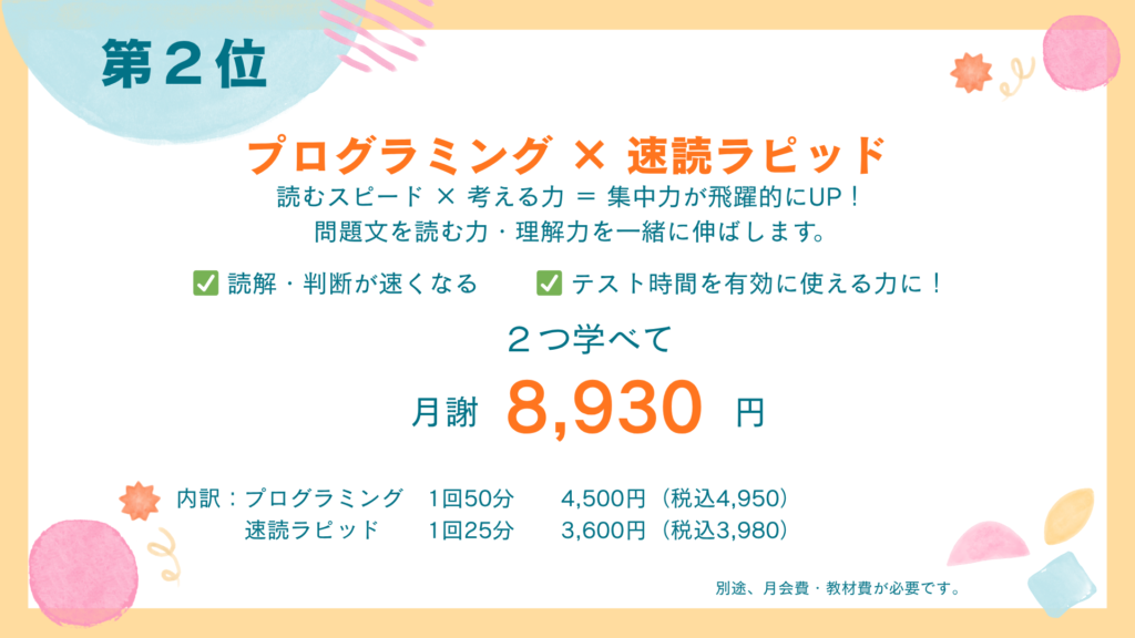 | 教材費 | 1科目500(550)・2科目700(770)・3科目900(990) | |