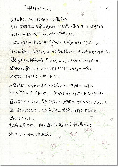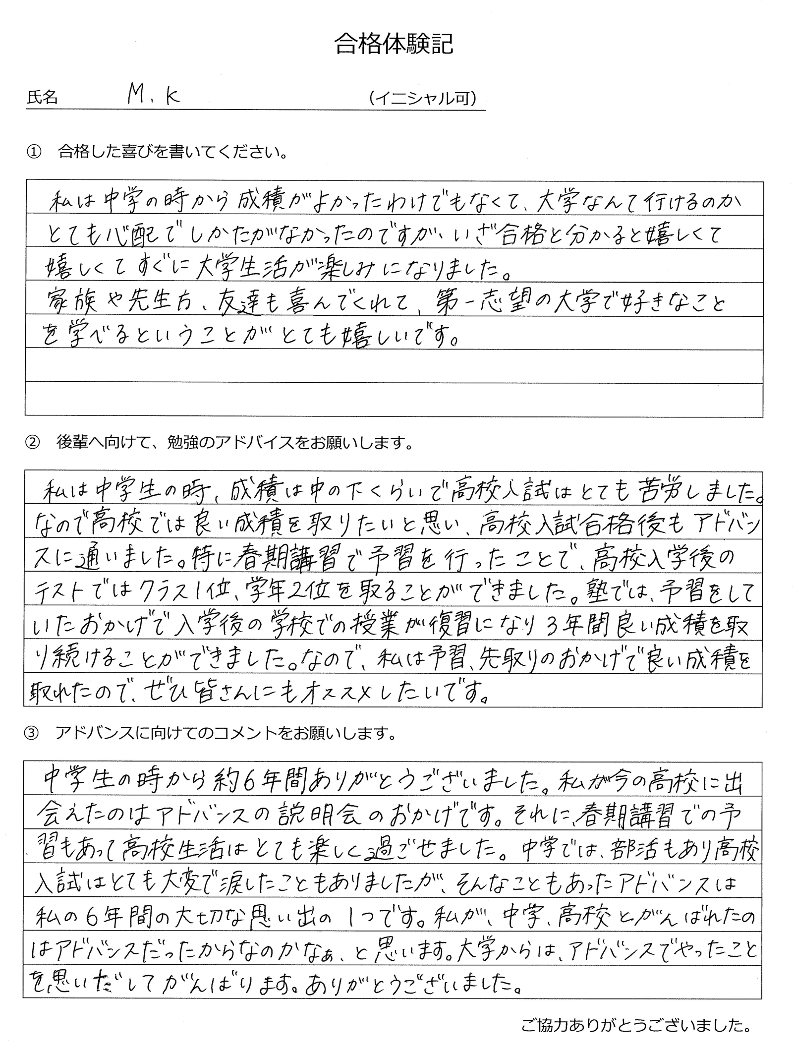 アドバンスが西宮の地で選ばれ続ける理由は、数字に表れる「合格実績」だけではありません。自走する力を手に入れた生徒たちの「成長の記録」と、それを見守るご家庭からの「深い信頼」こそが私たちの誇りです。地域密着の塾だからこそできる、一人ひとりに寄り添った指導の成果をぜひご覧ください。